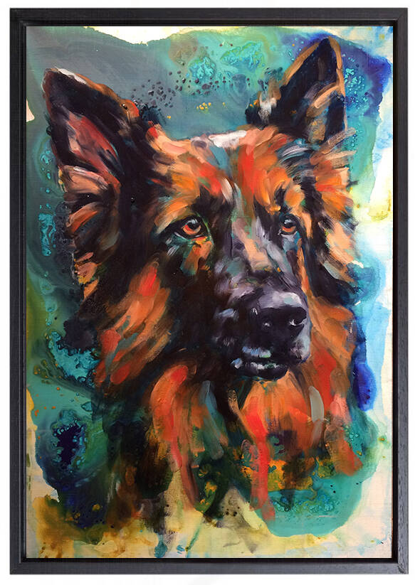 Behalve de prachtige kleding viel het ons op dat Carola ook heel mooi kan schilderen. We hebben een paar schilderijen kunnen kopen. Toen ontstond het idee om onze duitse herder Duuk door haar te laten schilderen hetgeen ze heeft gedaan. Het resultaat is mooier dan wij hadden kunnen denken. een echt kunstwerk en aanwinst aan de muur.